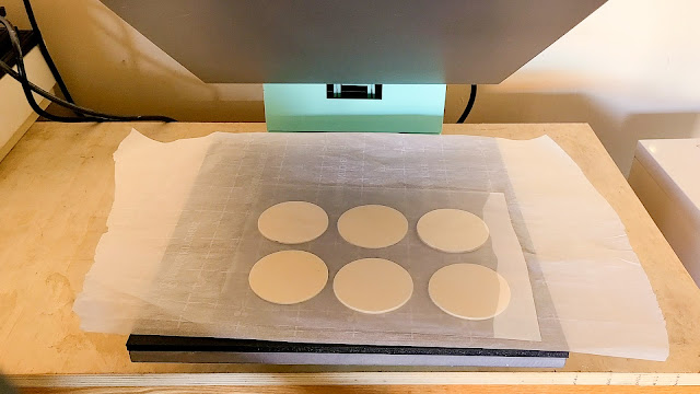 Next, cover them with another piece of parchment and press for 60 seconds. Remove the wood slices - the laminate will be stuck to them.