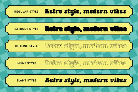 The font includes versatile styles such as Regular, Extrude, Outline, Inline, and Slant, offering endless creative possibilities. Its design is ideal for posters, packaging, headlines, and branding that want to channel the colorful, energetic spirit of the ’80s.