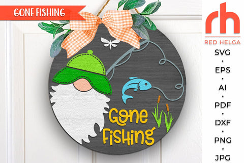 Gone Fishing SVG, Layered Door Sign Cut File, Summer Round Hanger DXF, Silhouette of a Gnome with a Fishing Rod, Lake Hanging Sign, Dad Gift, Fisherman Design - Cricut cut file, Silhouette cut file