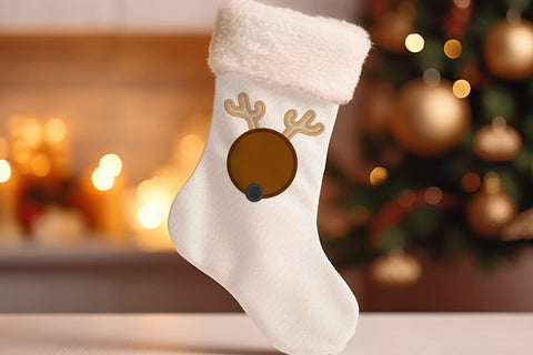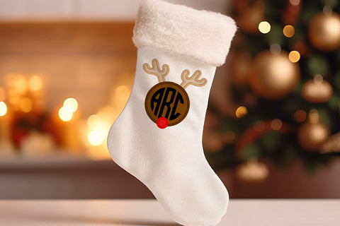 This embroidery design features a round monogram frame topped with antlers and a round nose at the bottom. The circle has an optional applique step. Perfect for putting your own circular monogram or design in the middle. (Monogram letters are NOT included, the photo is just an example of how the monogram would look with this design.)