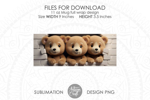 The 3D teddy bear breakthrough mug design shows cute teddy bears peeking through a hole in the wall. The high quality PNG file can be used to sublimate 11oz mugs and small tumblers. The teddy bear mug designs is perfect for making mugs for children as a gift for birthdays or graduation.