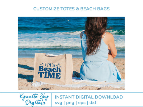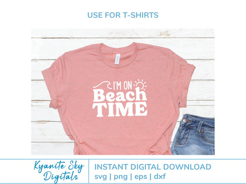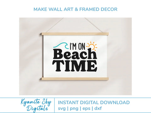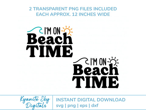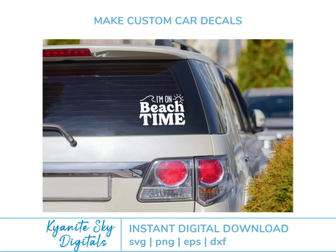 Vacation or summer quote "I'm on Beach Time" accented with a wave and sun. Customize with your choice of colors. Also includes version for cutting everything together from one color. For cutting with Silhouette, Cricut, etc. and other craft uses. Recommended to be cut from vinyl.