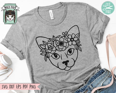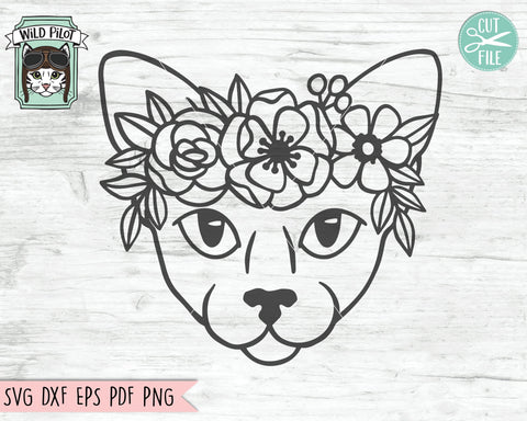 Cat Face SVG, Cat with Flower Crown SVG, Cat cut file, Animal Face, Animal Floral Crown svg, Cat with Flowers on Head, Sphinx Hairless Cat