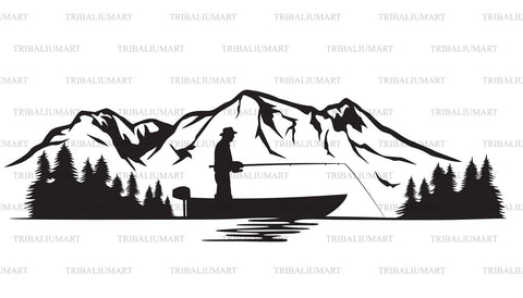 Fisherman in a boat and mountain landscape