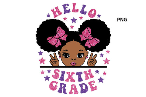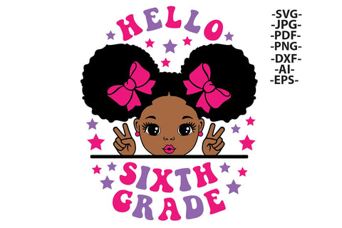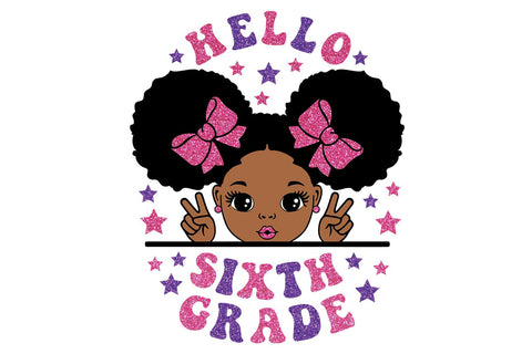 Hello Sixth Grade Girl SVG PNG EPS PDF Afro Puff Glitter Bows Peace Sign Back to School Sublimation Design for Cricut and Teachers