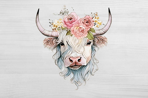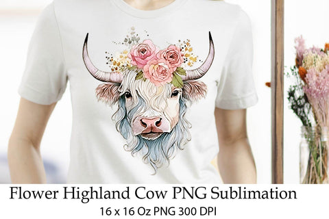 Floral Highland Cow Sublimation PNG Design. Watercolor PNG Design.