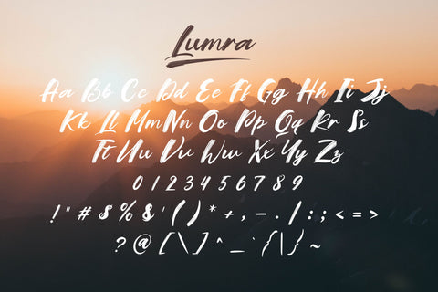 Lumra Regular – Script brush font with uppercase & lowercase letters, punctuation, numerals, and multilingual support.