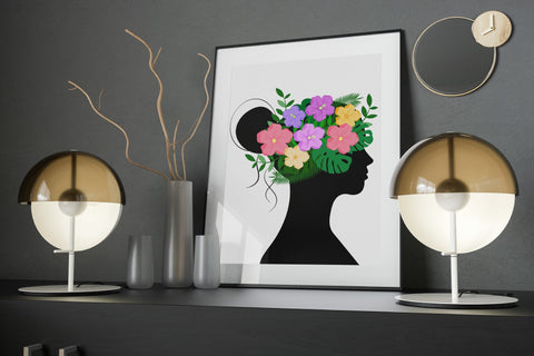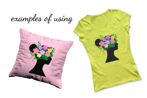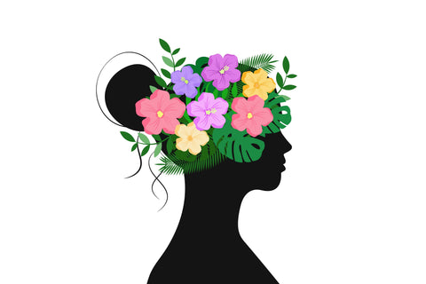 Vector illustration of female silhouette with flowers on her head as a symbol of mental health. Beautiful woman EPS illustration.