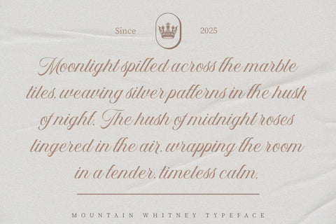 Mountain Whitney is an elegantly styled calligraphy script font that comes with beautiful alternate characters. a mix of copper calligraphy with handlettering style. Designed to present an elegant style. Mountain Whitney is attractive because it is smooth, clean, feminine, sensual, glamorous, simple and very easy to read. The classic style is very suitable to be applied to all types of formal items such as invitations, labels, menus, logos, fashion, make up, stationery, letterpress, romantic novels, magazines, books, greeting/wedding cards, packaging, labels.
