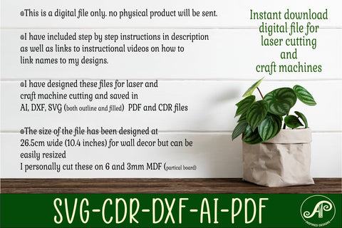 I have designed these files to cut around 20 to 30 cm wide (8 to 12inches) and on 6mm MDF (partical board) but can be done on other materials and at other sizes.