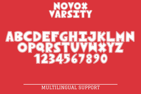 Novox Varsity is a striking display typeface inspired by classic collegiate lettering. With its bold block shapes, clean edges, and vintage varsity flair, this font brings the spirit of sports, school pride, and retro charm to your designs. Whether you're crafting team merchandise, yearbook covers, motivational posters, or nostalgic apparel, Novox Varsity delivers the confident impact of traditional athletic aesthetics.