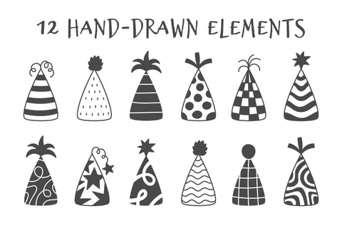 Hand drawn party hat bundle. Black line head accessories for birthday, holiday, celebration. Vector illustration in sketch style. Cute childish headwear clipart.