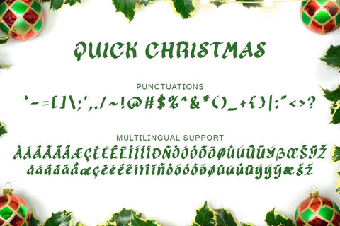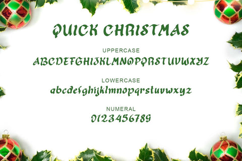 "Quick Christmas" is an elegant blackletter font. This font is equipped with uppercase, lowercase, numerals, punctuations and multilingual support. Very suitable for Christmas, Christmas greetings, banners, stickers, posters, summer, print, branding, mugs, tumblers, logos, t-shirts and others