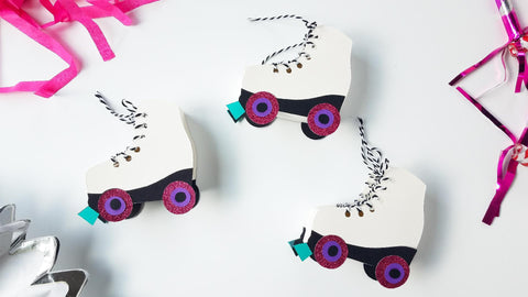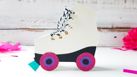 Party supplies are my most favoritest thing to design and to make at home, and this roller skate favor box is definitely at the top of my list! You can cut the pieces out using your favorite cardstock (and of course some glitter) or this template is designed specifically for easy print and cut to coordinate perfectly with your decor!
