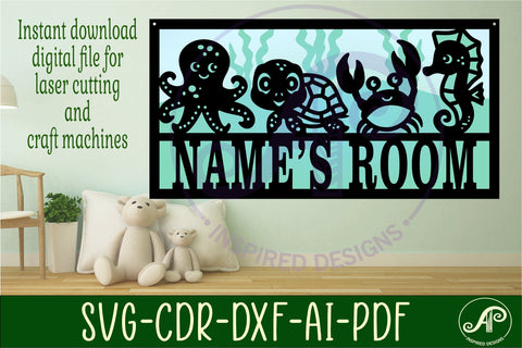This digital download features a designer personalized name sign for door or wall hanging. This is a SVG Laser Cut Files for laser machines, CNC routers and other craft machines. in DXF, AI, CDR and PDF formats too.