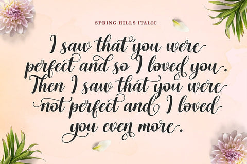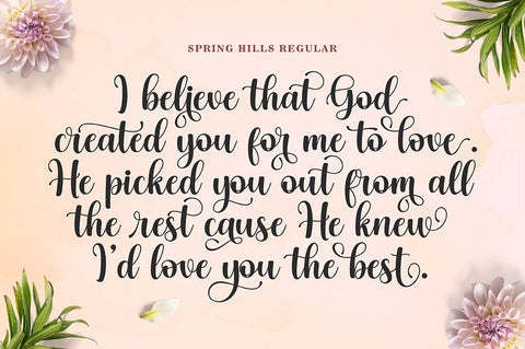 Spring Hills Script is a modern calligraphy font, including regular, italic and extras featuring a sleek and neat glyph. This font has a beautiful and balanced character, making it suitable for various purposes. such as written posters, wedding invitations, logos, product packaging, branding, titles, signs, labels, mugs, book covers, quotes, and others.