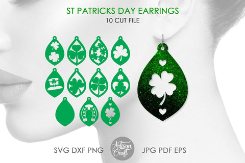 The Earring SVG cut file bundle contains 10 St Patrick's day earrings. The earrings have design elements related to Saint Patrick's Day such as clover leaves , horse shoe, leprechaun hat and hearts.