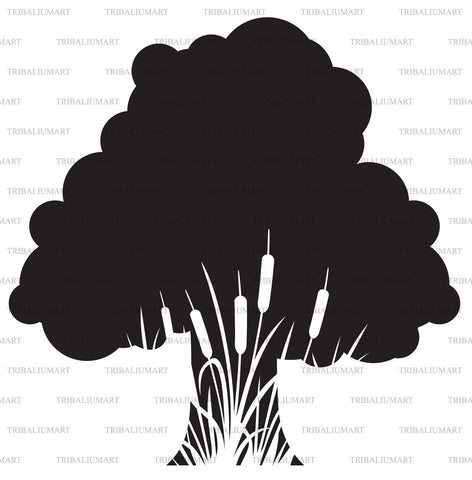 Tree silhouette and reeds silhouette