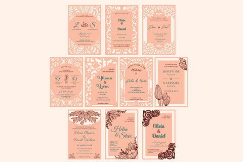 This is a comprehensive set of 10 laser-cut ready files for crafting exquisite and unique wedding invitations from plywood or MDF. Each design in the collection features intricate cut-out patterns, elegant borders, and dedicated spaces for personalized wedding details such as names, dates, times, and venues. These invitations offer a luxurious and memorable alternative to traditional paper invites, providing a tactile and visually stunning preview of your special day. Ideal for couples seeking a unique, handcrafted, or rustic yet elegant touch for their wedding stationery. Optimized for precise laser cutting, these files ensure beautifully detailed and high-quality invitations that will truly impress your guests.